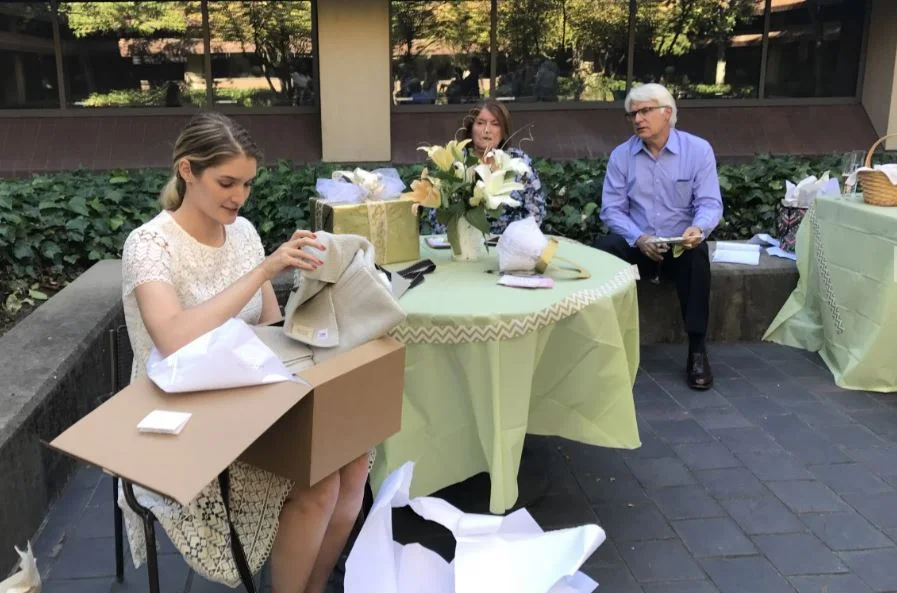Opening gifts at my lovely work shower (thanks to my coworkers for planning!). Wearing: white dress